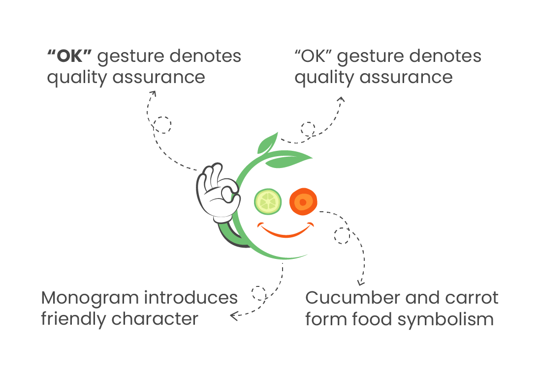 The friendly, cartoon-style monogram features cucumber and carrot slices for a playful, food-centric identity. A crown of leaves strongly symbolizes the vegan commitment, and the “OK” hand gesture actively conveys quality, trust, and satisfaction. The DynaPuff font adds a rounded, youthful appeal that perfectly aligns with the brand name.